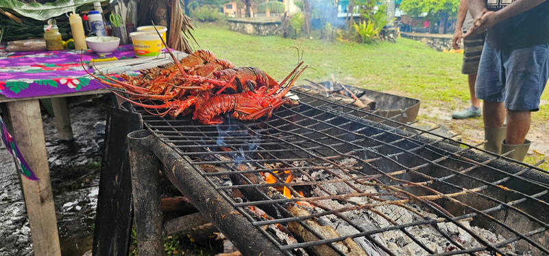 At the Wé Market, there were two outdoor BBQ cook centers set up with local foods being prepared. The most interesting foods were the lobsters and the fish. They had several different items on the grill including two Spiny Lobsters, two Mud Crabs (red dots), some Sea Lobsters, and a couple Coconut Crabs which looks like an overgrown sea lobster. The coconut crab lives in coconut trees and eats coconuts as well as other items on the land and before it is cooked it is a blue colour. It does not go into the water at all. The locals also had both Mackerel and Parrot Fish on the grill, but there wasn't anyone risking the local cuisine.
